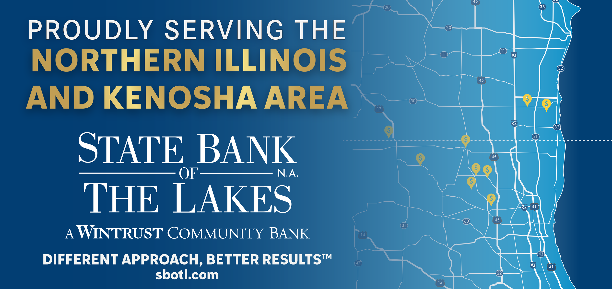 The billboard features a simplified, easy-to-read map that outlines the neighboring regions of Wisconsin and Illinois, emphasizing the bank’s wide outreach. Key SBOTL locations are prominently marked with bold, clear pin indicators, to ensure easy identification for viewers. To guide the eye smoothly across the billboard, the map highlights major roads and landmarks, allowing customers to quickly recognize their proximity to a SBOTL branch.